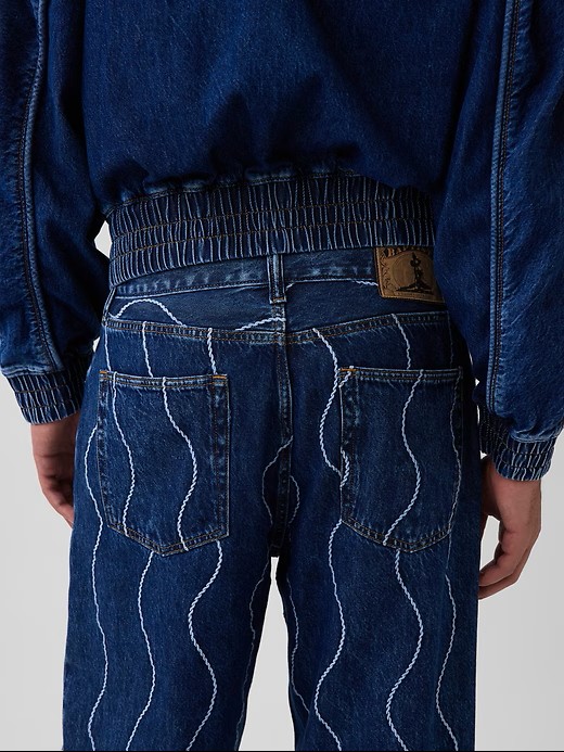 Ocean-blue straight-leg jeans feature wave stitching that subtly echoes the Atlantic journey, while a spread-collar denim bomber is elevated through embroidered detailing. The four pieces speak to the fluidity of identity and the strength found in diaspora. For Baptiste, denim is not only functional; it becomes a map of memory.