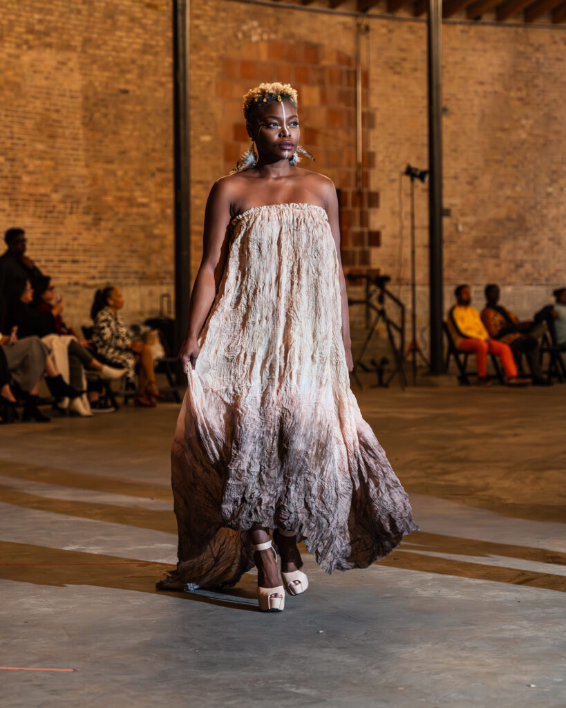 Each look told a story of resilience, identity, and transformation, and were created using a variety of organic cotton & denim, jacquard, handmade kozo paper and textured gradient tie-dye fabrications.