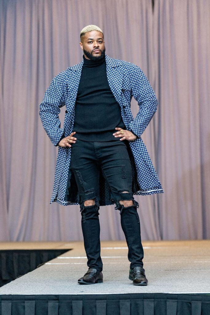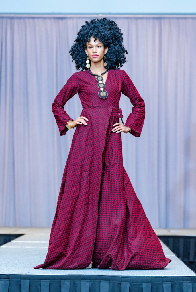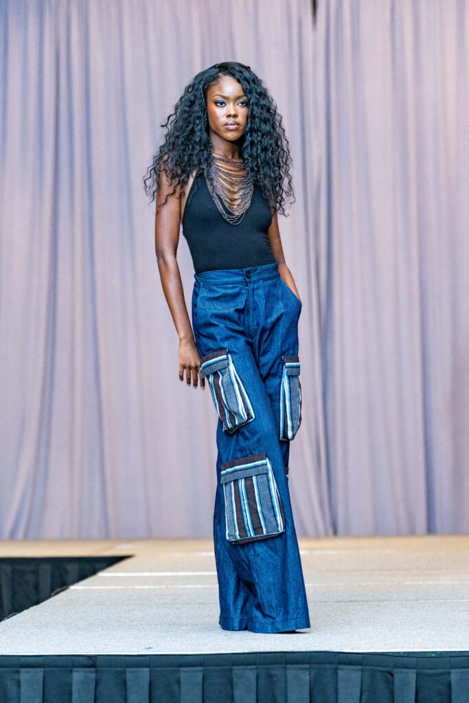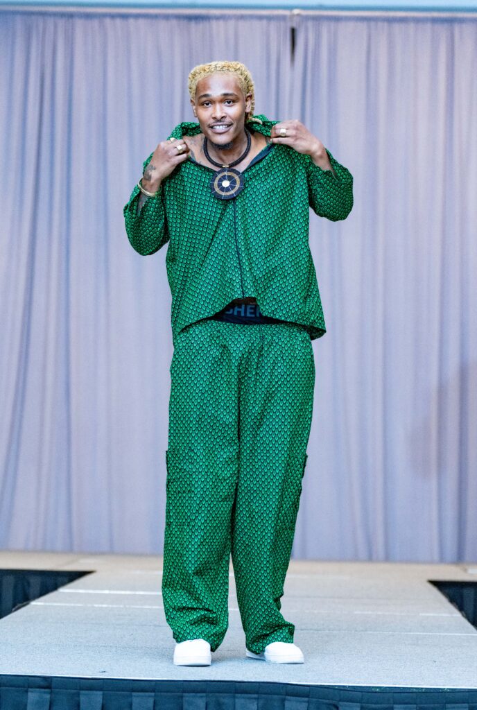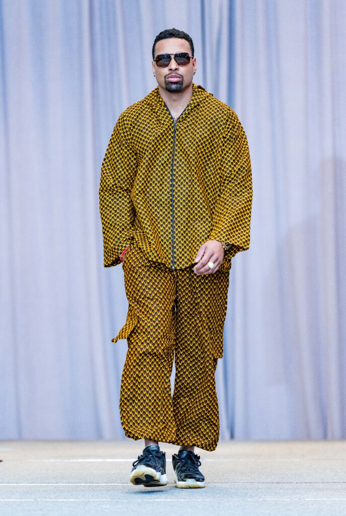 Inspired by fish scales, the Azu fabric glimmered under the lights, symbolizing both fluidity and strength. The name Azu, meaning “fish” in Igbo, ties back to the collection’s cultural roots and layered textures that even evoke the look of armor.
