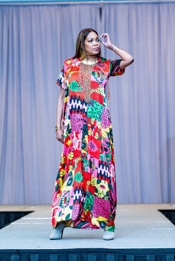 Highlights included multi-pattern cargo pants in vivid green, black, yellow, blue, and red tones, along with a striking red-and-white silk kaftan that stole the show.
